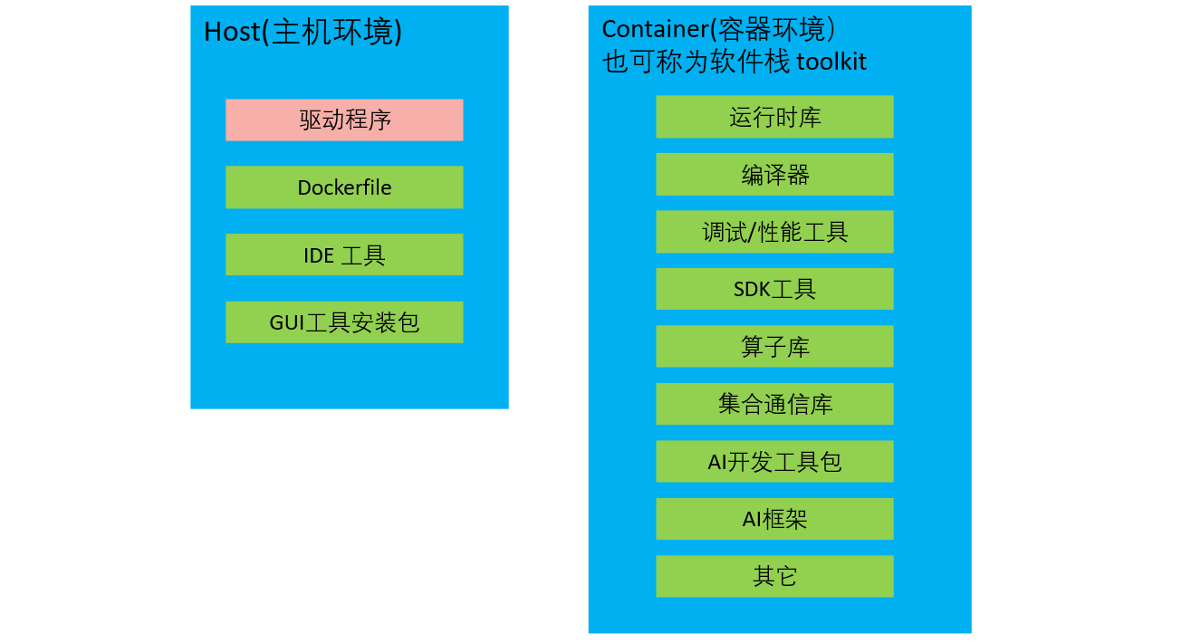 指容器环境,驱动软件不能安装在Container端, 建议使用容器环境安装软件栈 |